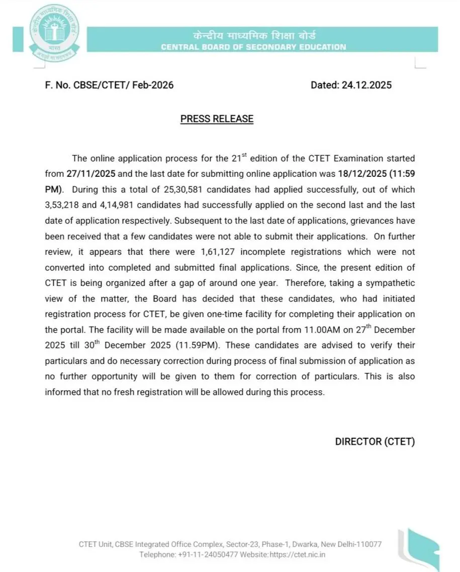 CTET 2025 Application Form Completion Notice